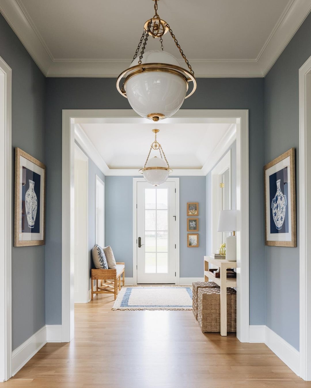This hallway has a calming and bright aesthetic using soft blue walls.